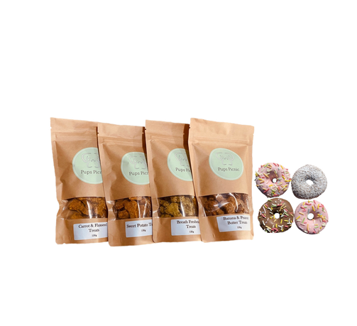 Banana & Peanut Butter, Sweet Potato, Carrot & Flaxseed, Breath Freshener & Pup Nuts.